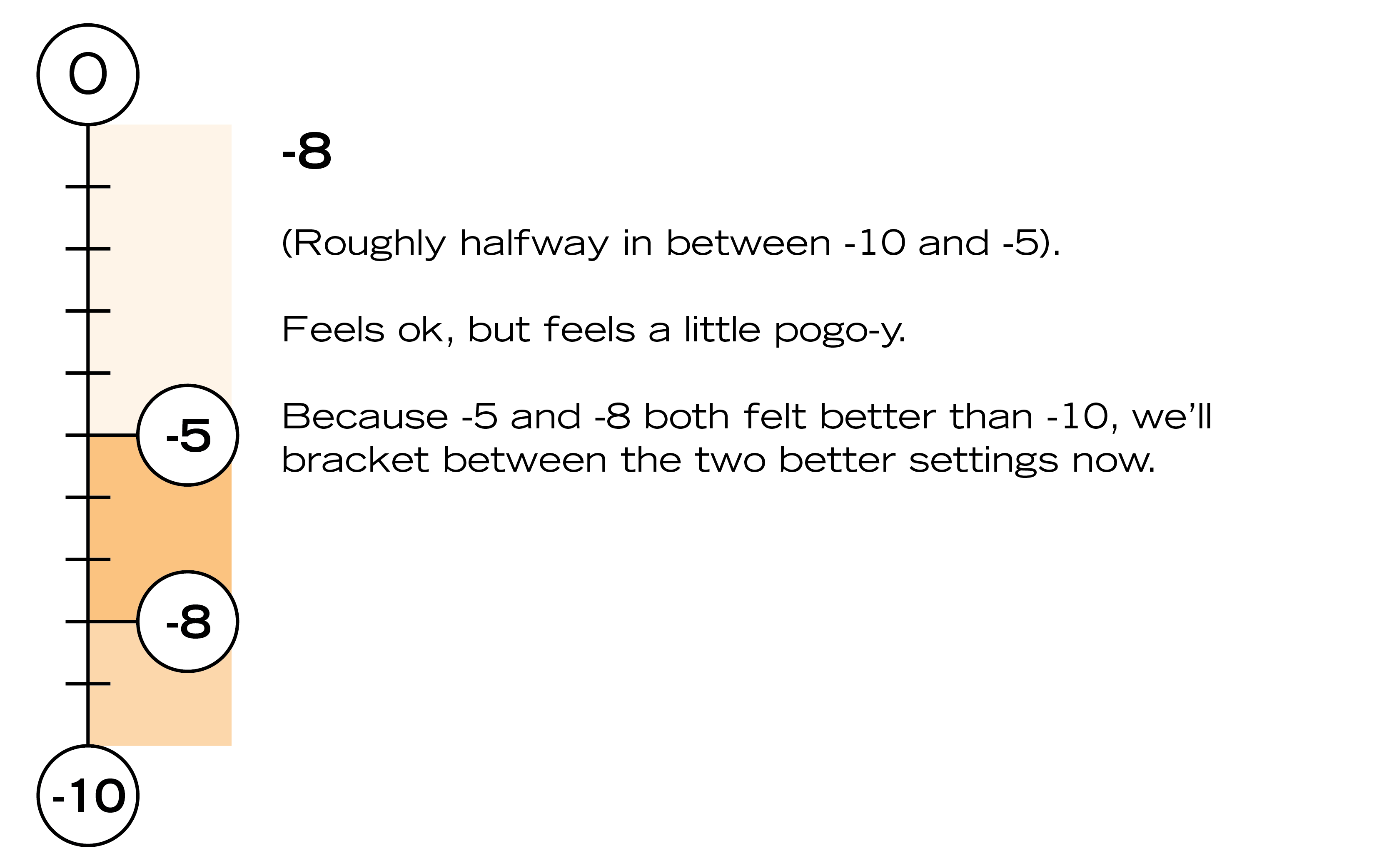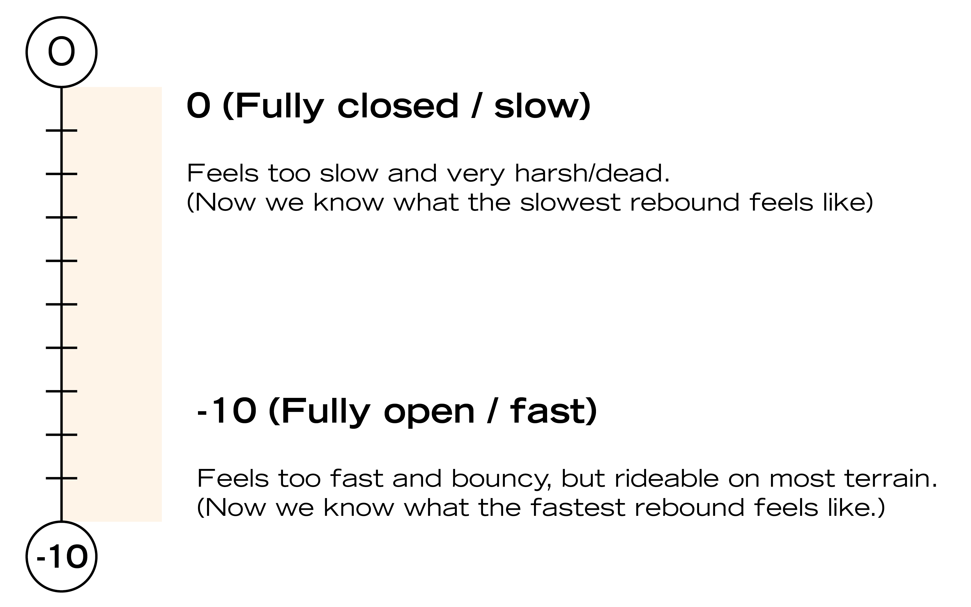 Bracketing allows you to narrow in to your preferred settings without really needing to know much other than a vague sense of “better”, “worse” or “no different”. You don’t have to start at 0, but riding on the extremes a little bit will allow you to get an idea of what the range and capabilities of the suspension adjustments are, and give you a good idea on how the adjustments affect how your suspension feels.