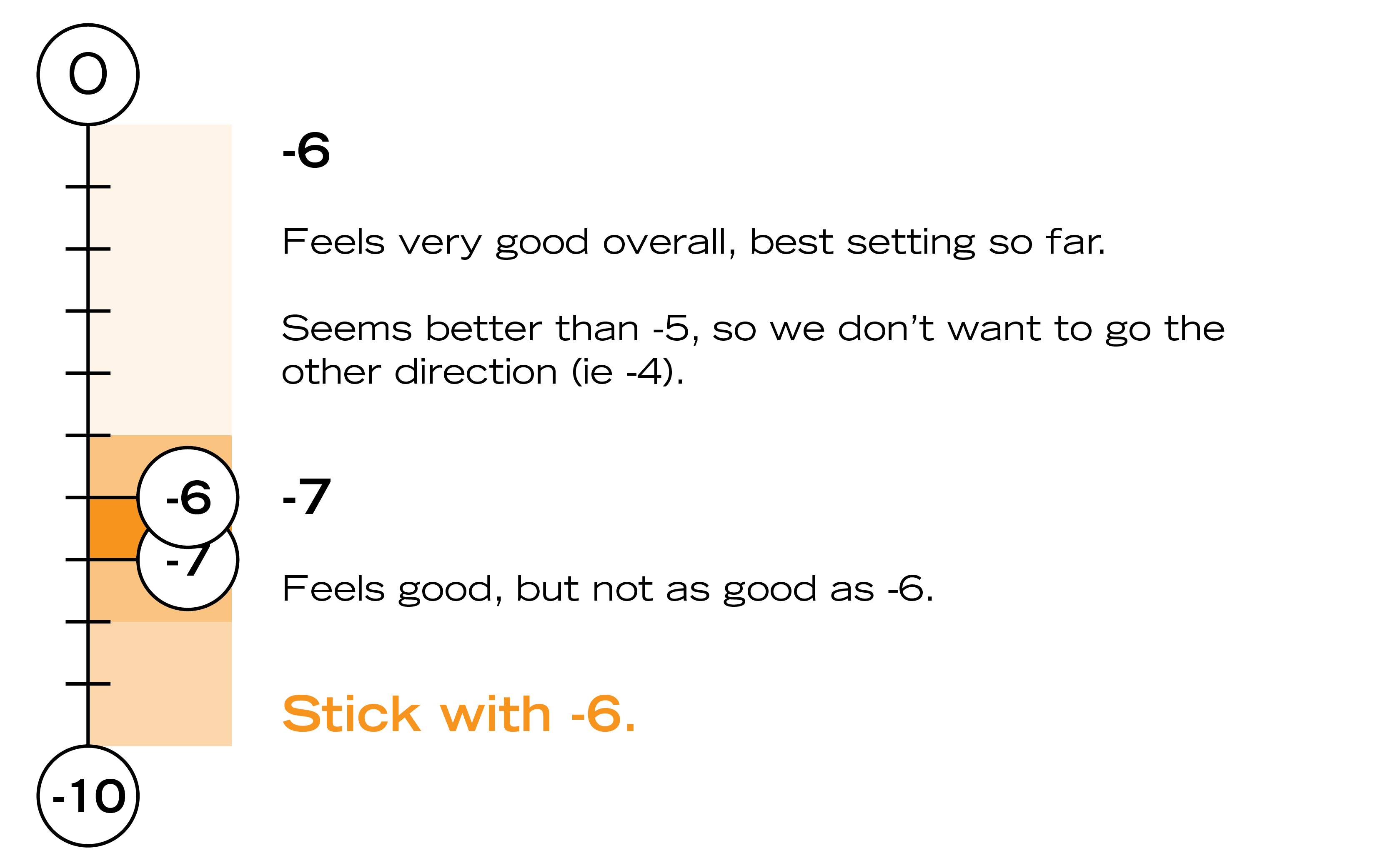 The principle of bracketing is that you start by trying the two extremes of the adjustment range, then adjust to a setting that’s roughly halfway between the two. Determine which of the three you preferred the LEAST, and then adjust halfway between the other two “better” settings. Repeat that process, splitting the difference between the two settings you liked the most.