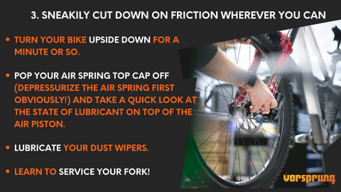 Air springs and wiper seals in particular cause a lot of the friction in your fork. Friction is the number one enemy of suspension performance - the ideal amount is zero. Unfortunately, here in the real world, that never happens, so here's a few quick ways to improve friction in the short term: