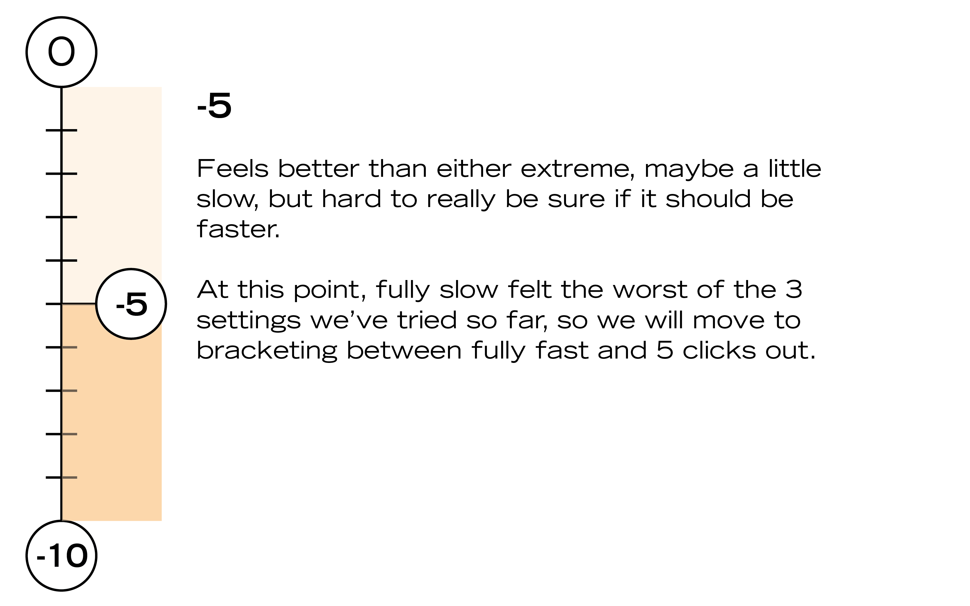Here is an example of how bracketing works, on a rebound adjuster with 10 clicks of adjustment. The clicks are measured as a negative number from fully closed/fully slow: